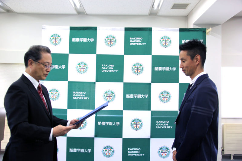 10月21(月)、一般社団法人Jミルクの岡本隆雄常務理事と同社マーケティンググループの池上秀二次長が本学を訪れ、本学において表彰式を行いました。
