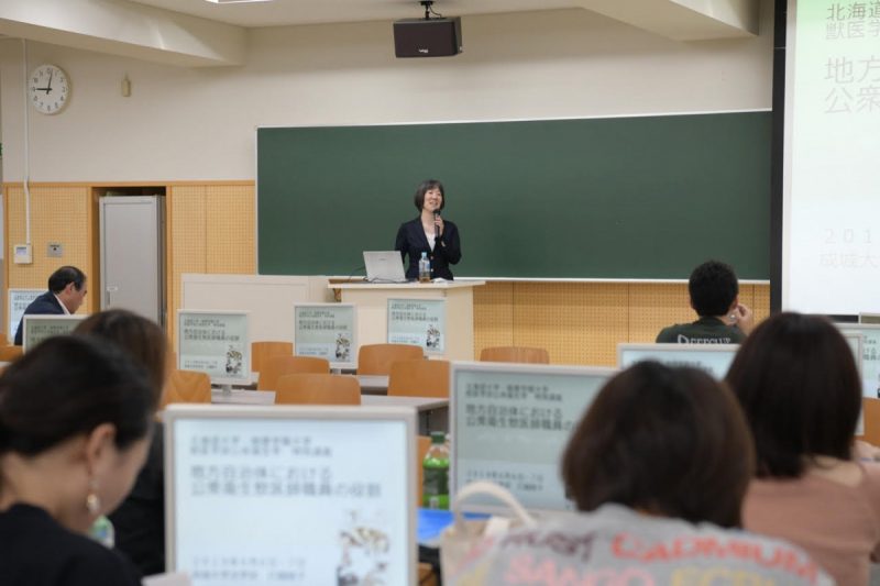 6月6日(木)に開講の獣医公衆衛生学総論(担当:田村 豊教授)の時間を使い、環境省の動物福祉政策にも行政学の立場から深く係っている成城大学法学部教授の打越綾子先生に、「地方自治体における公衆衛生獣医師職員の役割」と題して特別講義をお願いしました。たまたま北海道に来られる機会を利用して特別講義をお願いして実現しました。前日には、北海道獣医師会主催の獣医公衆衛生講習会において、最近話題となっている「多等飼育問題に関わる論点整理」と題して、北海道や札幌市で動物愛護対策に携わる多数の公務員やボランティア団体の方々に対して講演を行いました。非常にホットな話題であったせいか、熱い議論が展開されました。獣医公衆衛生学総論は、獣医学類3年生が履修するもので、まだ将来の進路が決定していない学生にとっては、これまで聞くことのない社会科学の研究者からみた公衆衛生獣医師の役割の解説であり、獣医師であっても気が付かない様々な視点は非常に興味深いものでした。