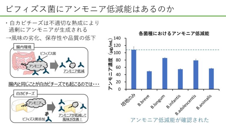 発表題名:ビフィズス菌添加による白カビ熟成チーズのアンモニア低減効果の検討