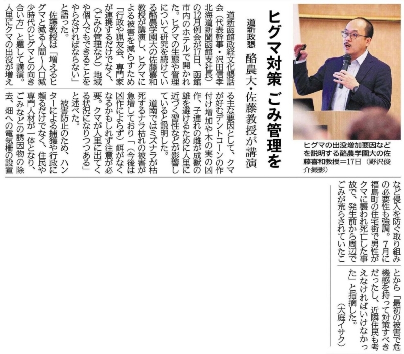 2025年12月18日(木)の北海道新聞(函館・道南)15面にて、本学環境共生学類佐藤喜和教授(野生動物生態学研究室)が道新函館政経文化懇話会で講義した様子が記事に掲載されました。