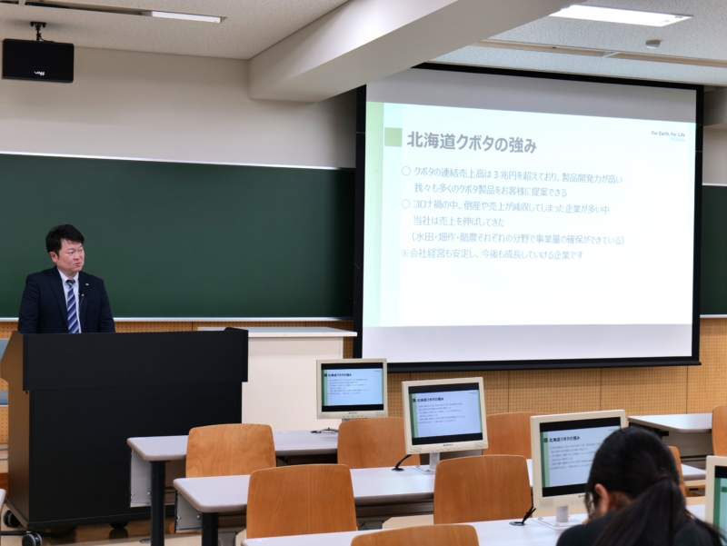 講師には、株式会社北海道クボタのスマート農業推進課の今野智望氏と総務人事課の小野大樹氏を迎え、学生たちに特別講義が行われました。