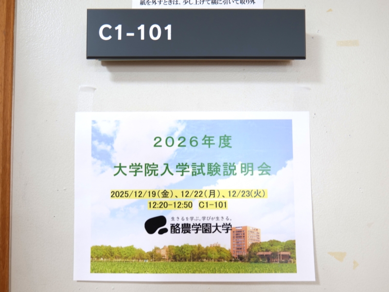 2025年12月19日(金)に本学のC1-101教室において、酪農学園大学大学院への進学を希望する本学学生を対象として、大学院入学試験説明会を開催しました。