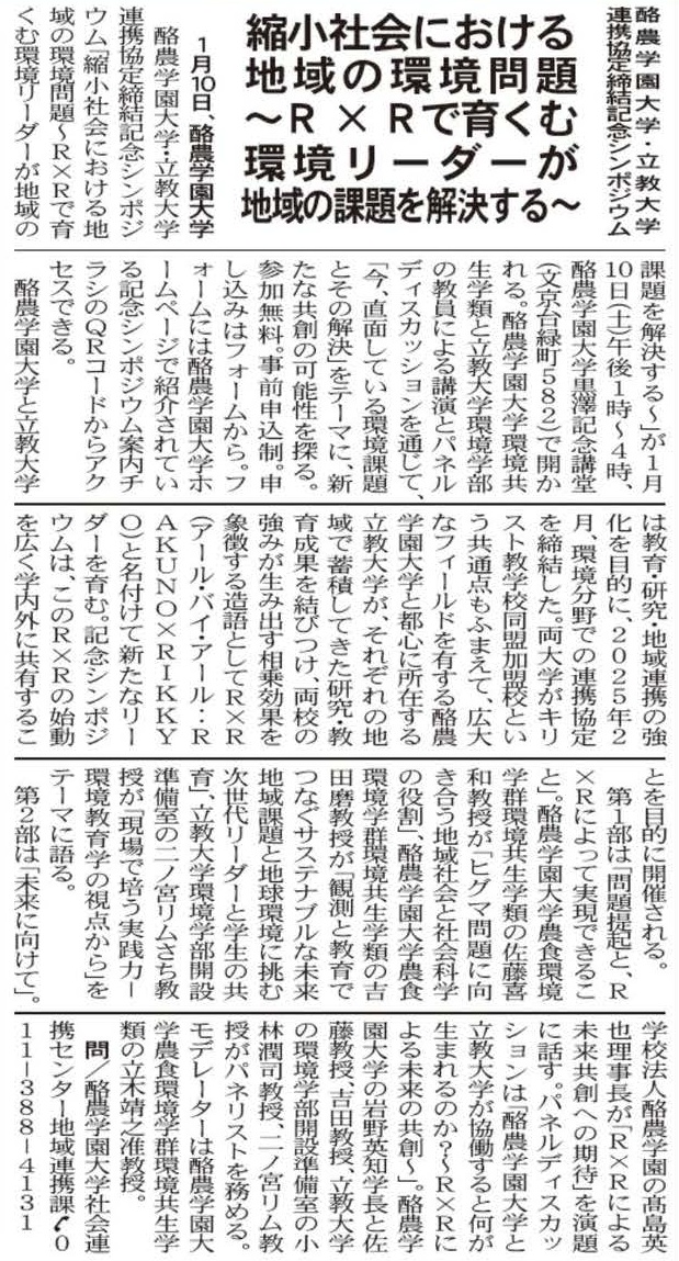 ◆2025.12.03 [プレスリリース]酪農学園大学・立教大学 連携協定締結記念シンポジウム 「縮小社会における地域の環境問題 ~R×Rで育くむ環境リーダーが地域の課題を解決する~」を開催