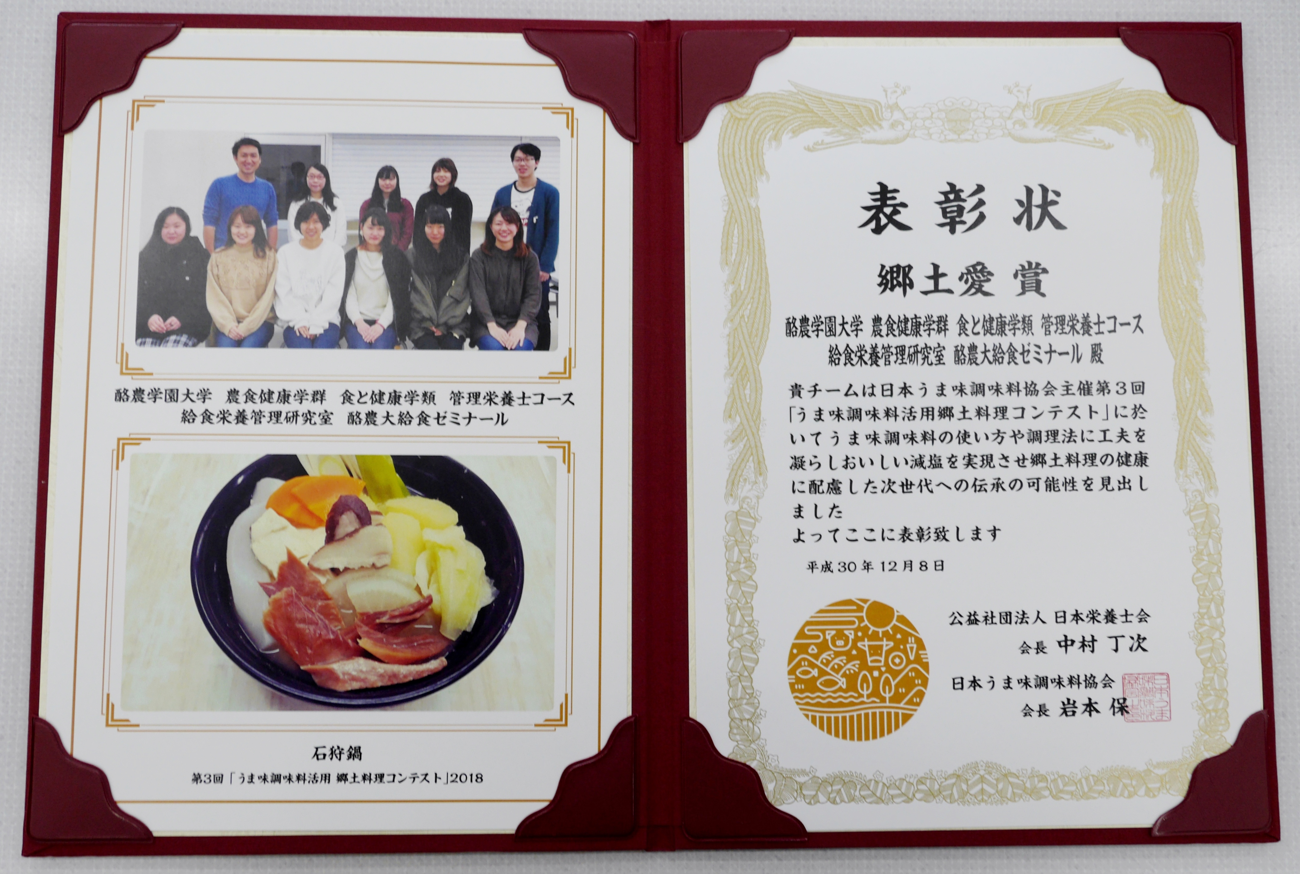 食と健康学類管理栄養士コースの学生が「うま味調味料活用郷土料理コンテスト」郷土愛賞受賞