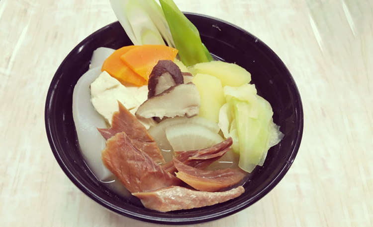 北海道では一般的に食されている石狩鍋を災害食に応用することを試みました。災害時には水の使用や調理方法が限られることから食塩摂取量が多くなりやすいといった問題に着目し、伝統的なレシピで使われる生鮭と生椎茸をそれぞれ保存のきく鮭とばと干し椎茸に替え、うまみ調味料を活用して減塩しても十分な美味