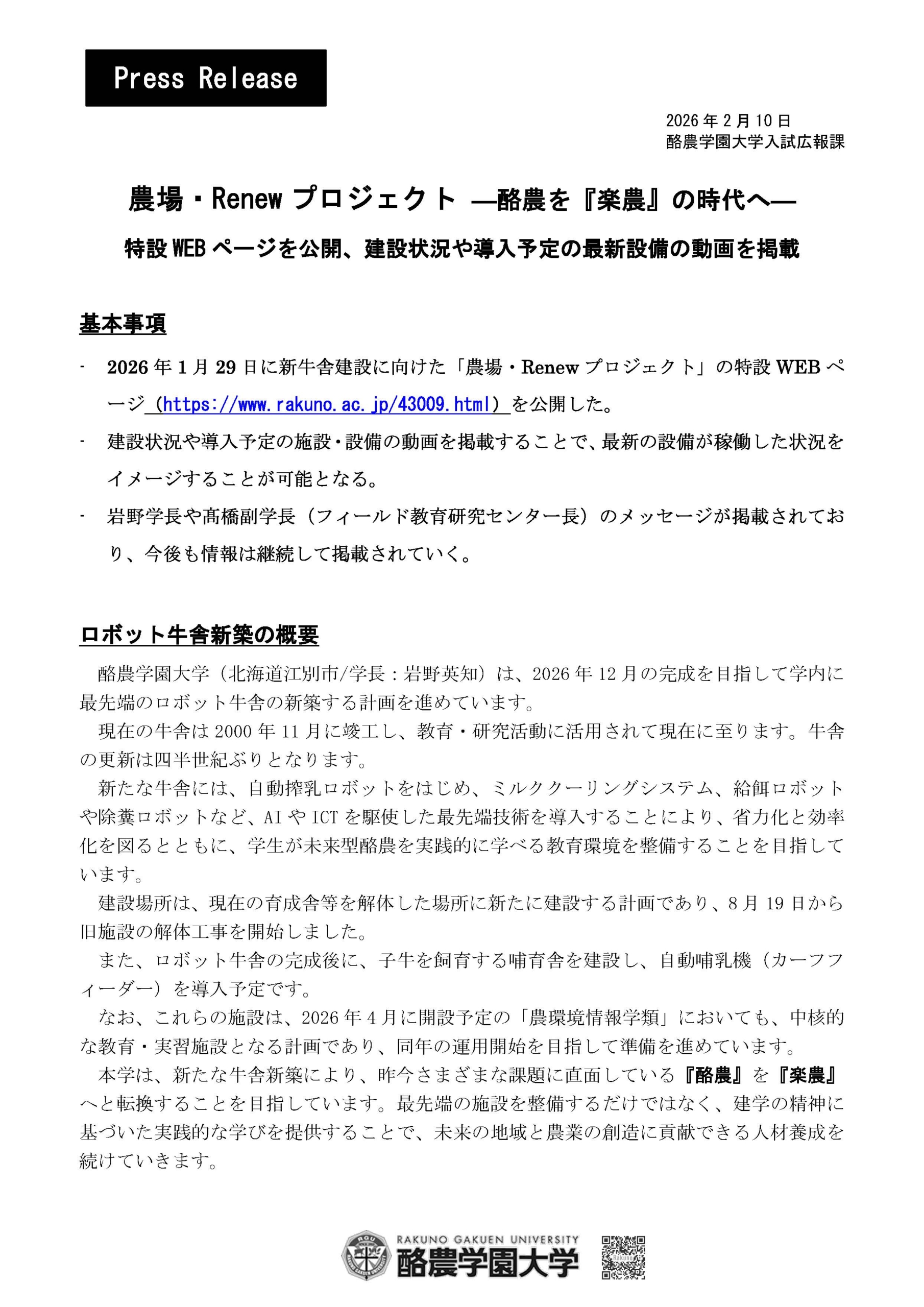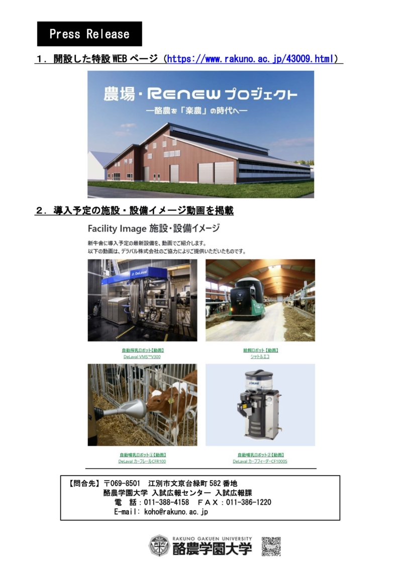 酪農学園大学は、2026年1月29日(木)に新牛舎建設に向けた「農場・Renewプロジェクト」の特設WEBページを公開しました。岩野学長や髙橋副学長(フィールド教育研究センター長)のメッセージが掲載されており、今後も新たな情報を掲載していく予定です。建設状況や導入予定の施設・設備の動画を掲載することで、最新の設備が稼働した状況をイメージすることが可能となりますので、ぜひご覧ください。