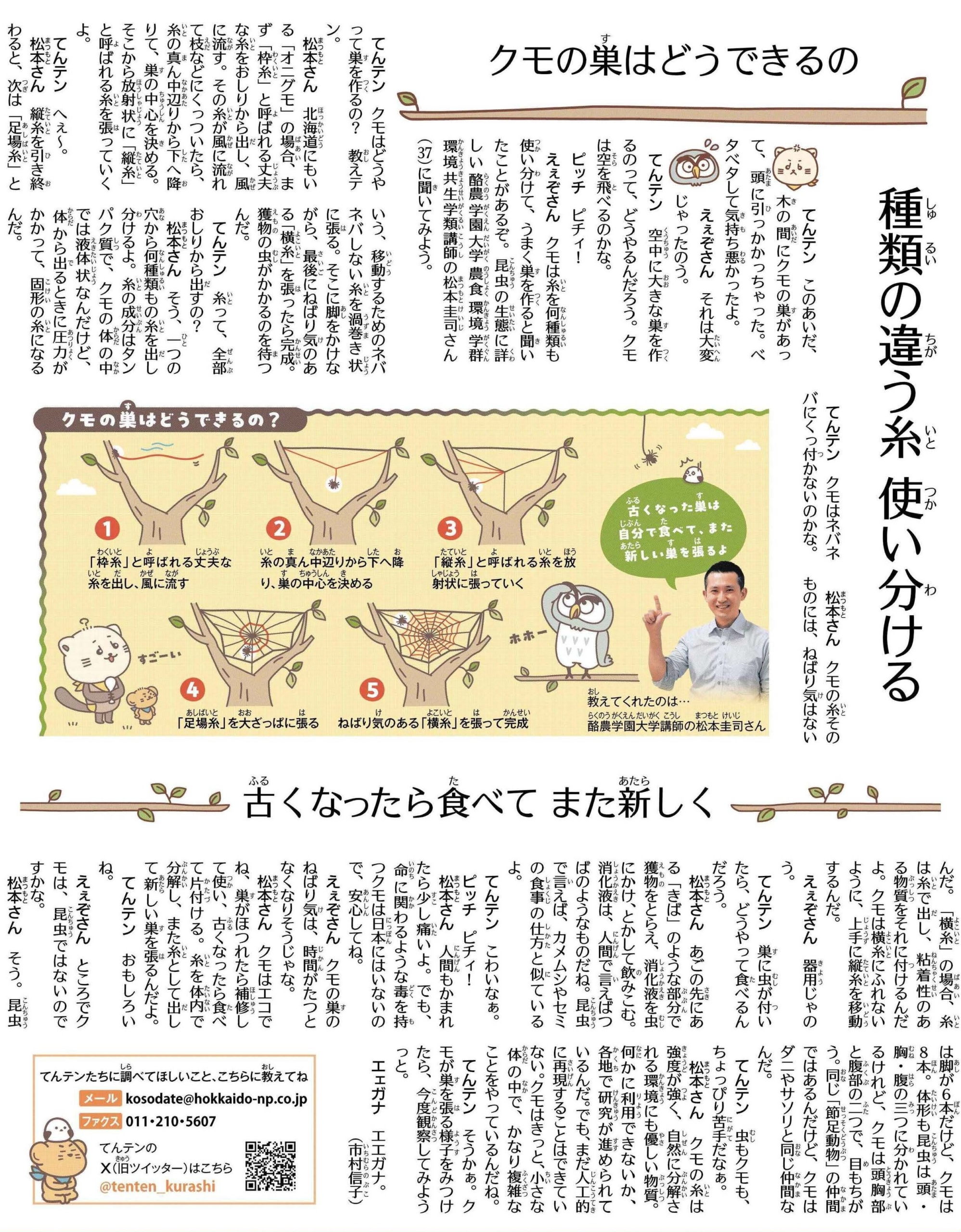 2026年2月13日(金)の北海道新聞11面(教育)にて、本学環境共生学類 松本圭司講師がクモの巣について解説した記事が掲載されました。