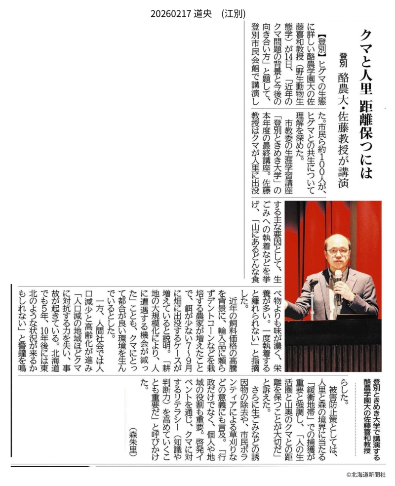 2026年2月17日(火)の北海道新聞14面(江別)に、本学環境共生学類 佐藤喜和教授が登別市で行った講演についての記事が掲載されました。