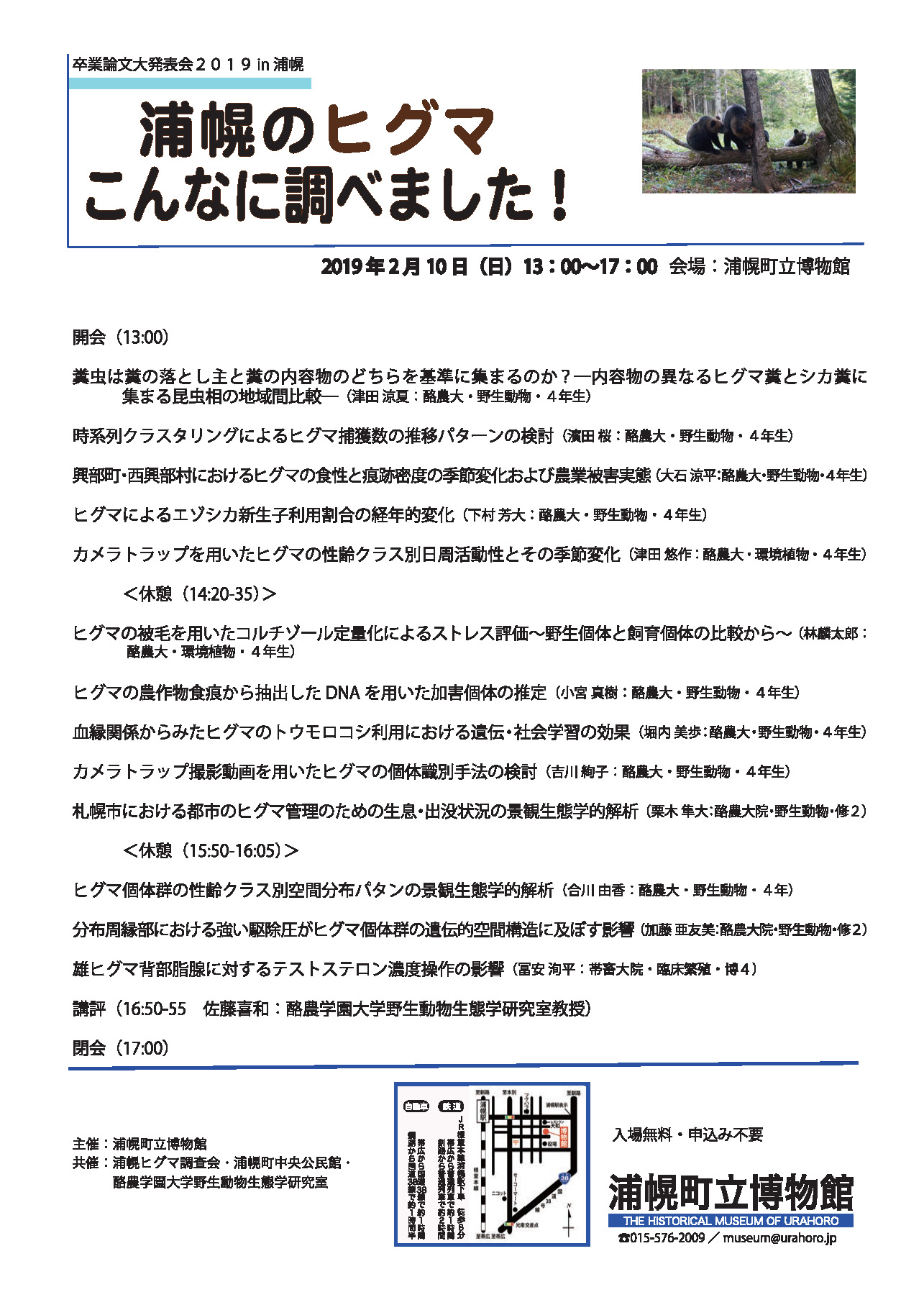 浦幌町は、知る人ぞ知る日本のヒグマ研究のメッカです。毎年、本学の学生たちが町に滞在し、山中を駆け巡ってヒグマの研究に挑んでいます。今年も大学生や大学院生たちが、浦幌町立博物館で自分たちの研究成果を大いに語ります。