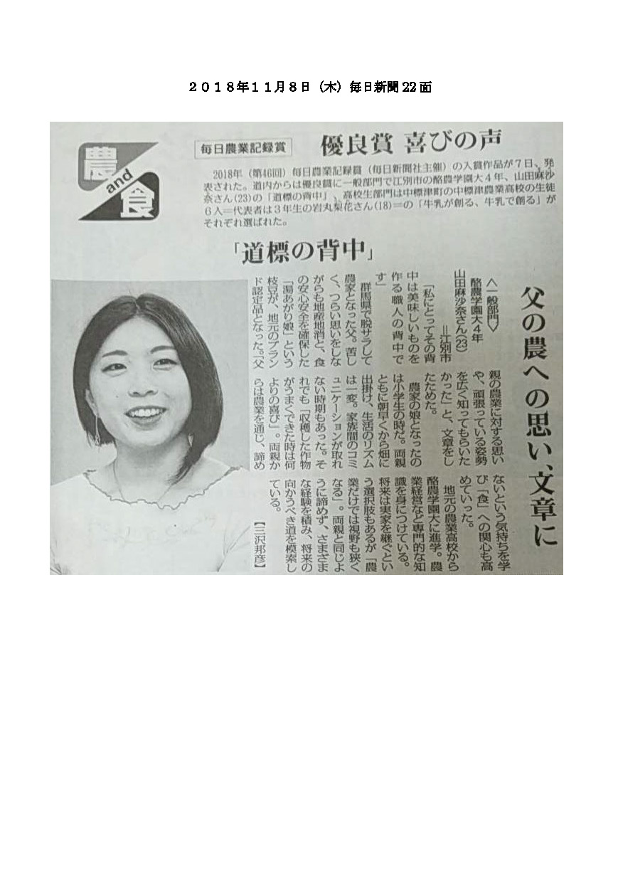 昨年11月7日に、農・食・環境への思いや体験をつづる作文コンクール「2018年度(第46回)毎日農業記録賞」(毎日新聞社主催)の入賞作品が発表されました。