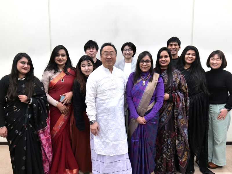 大学での研修最終日には、蒔田教授も参加者と一緒にバングラデシュの民族衣装を身にまとって研修を行いました。