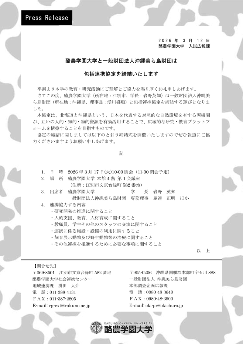 さてこの度、酪農学園大学(所在地:江別市、学長:岩野英知)は一般財団法人沖縄美ら島財団(所在地:沖縄県、理事長:湧川盛順)と包括連携協定を締結する運びとなりました。