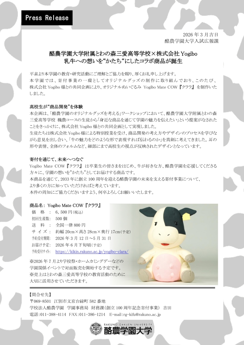 本商品を通じて、2033年に創立100周年を迎える酪農学園の未来を支える寄付事業について、より多くの方に知っていただければと考えています。本件の周知にご協力くださいますよう、何卒よろしくお願いいたします。