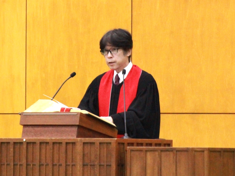 式は、小林昭博宗教主任の司式のもとキリスト教の礼拝形式で行われ、オルガンの前奏、招詞(招きの言葉)のあと、讃美歌21 532番を歌い、聖書(マルコによる福音書 4章35~41節)朗読、祈祷が捧げられました。その後、岩野英知学長より学群学類・大学院の総代に学位記が授与されました。