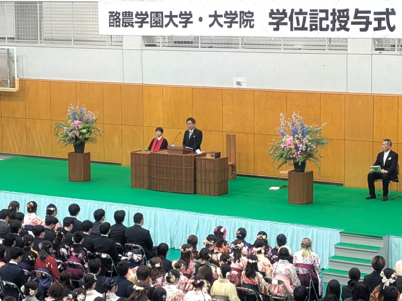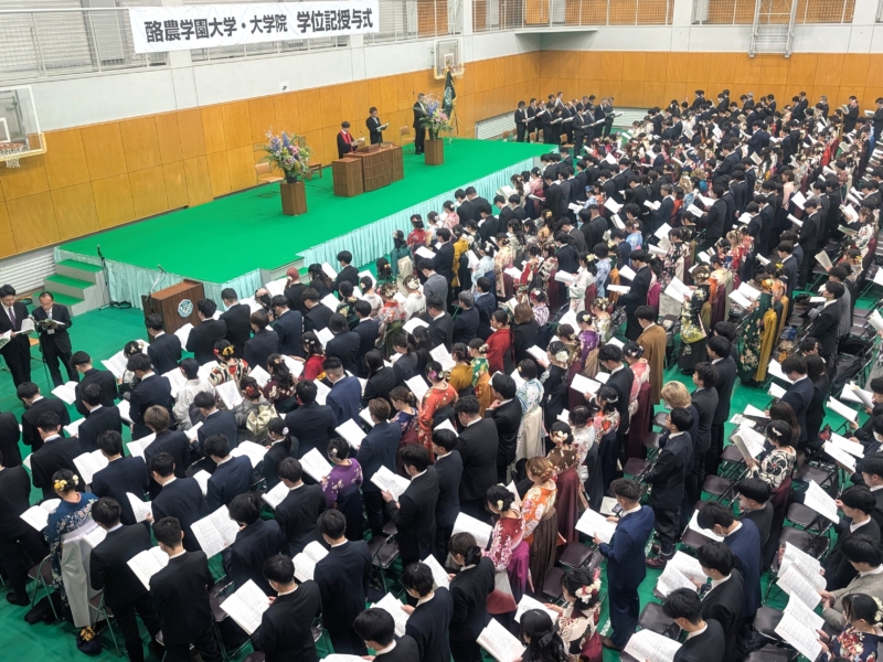 3月19日(木)、酪農学園大学健民館2(体育館)にて、2025年度学位記授与式が執り行われ、560名(学群531名、大学院29名)が新しい門出を迎えました。