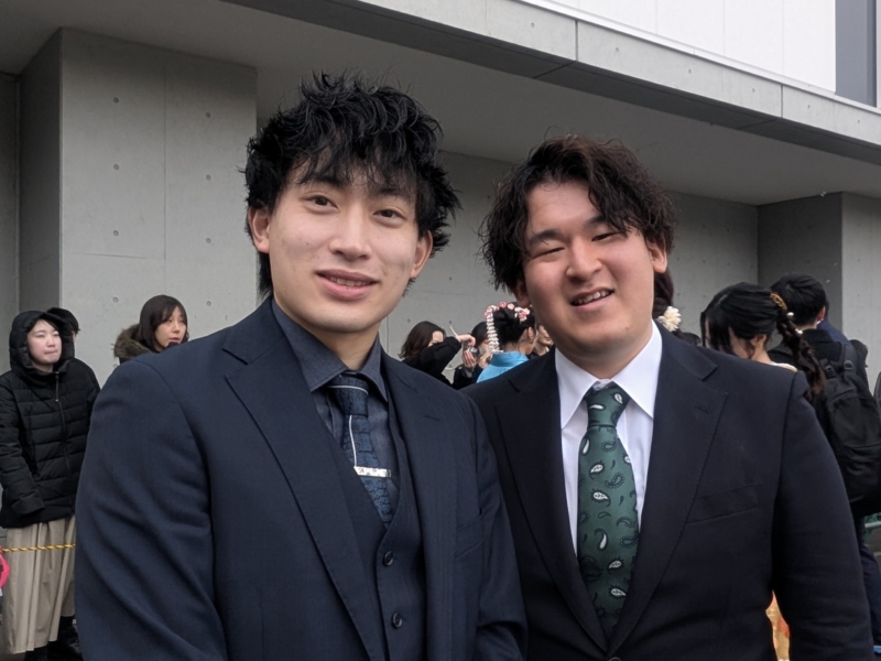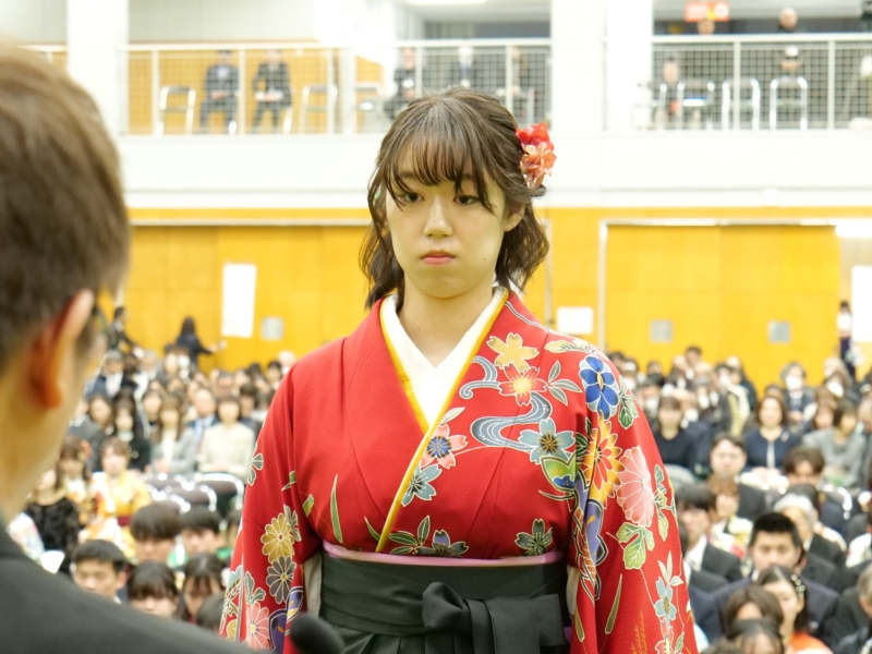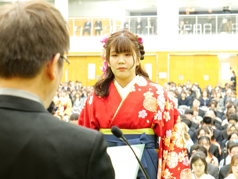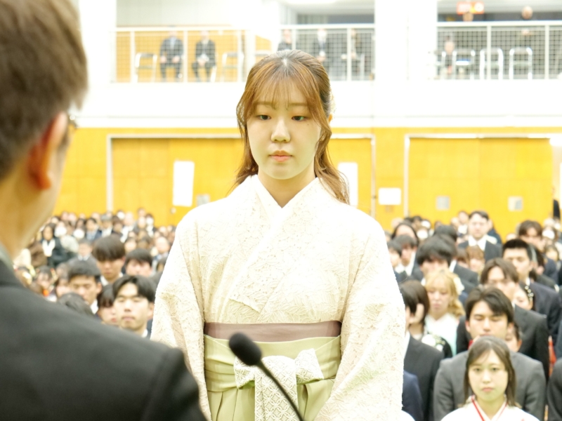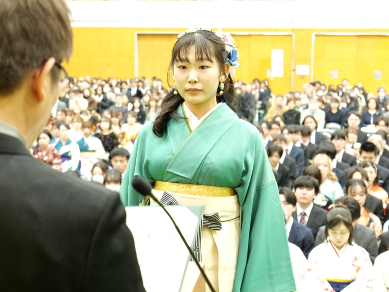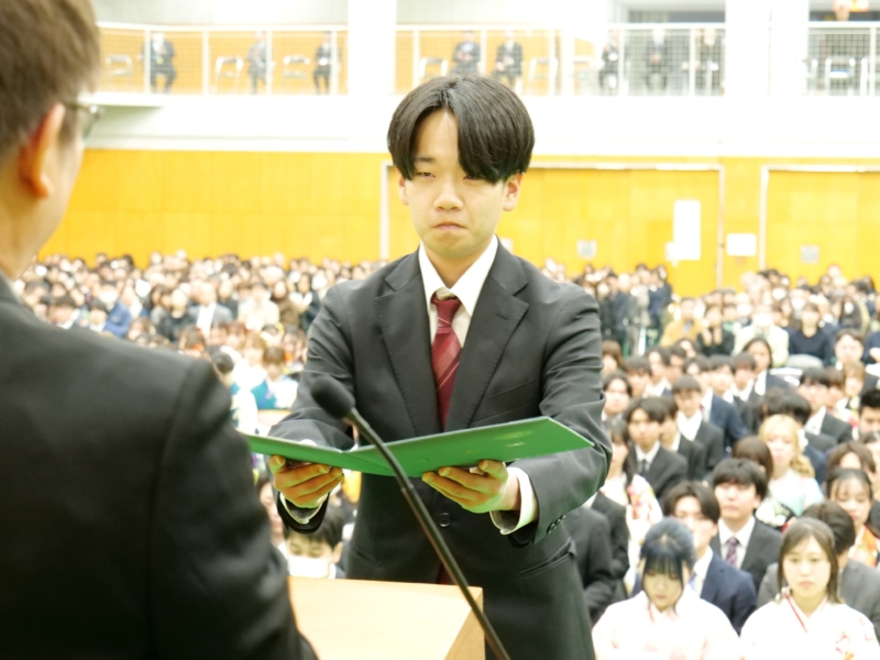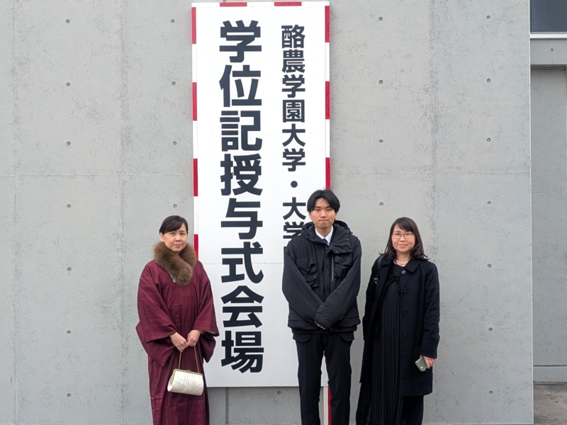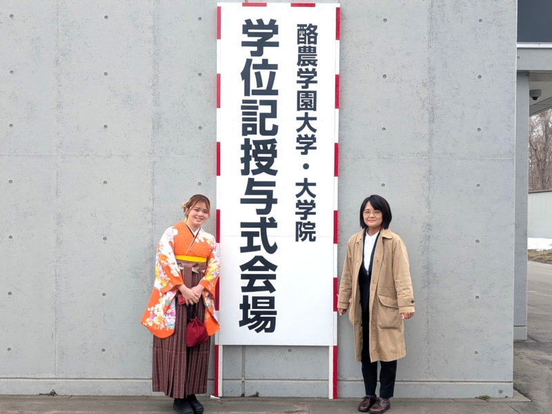 鍜冶さんは「入学当初は知り合いもおらず、不安な気持ちで大学生活が始まりました。しかし、授業や日々の学生生活を通して少しずつ友人ができ、気づけば共に支え合える大切な仲間と出会うことができました。1年次に行われた基礎ゼミ農園での活動では、仲間と力を合わせて作業に取り組み、協力することの大切さや、共に目標を達成する喜びを学びました」と振り返りました。また、「酪農学園大学での学びは教室の中だけにとどまらず、豊かな自然に囲まれた環境の中で、生命、食、環境について実践的に学び、自然と人とのつながりの大切さを実感する機会を数多く得ることができました。3年次には講義に加えて実習もより専門的かつ実践的な内容となり、多くの知識と技術を学ぶことができました。とりわけ洞爺湖での実習では、沿岸やボート上からの湖水採取や水質観測、河川水の採取や採泥を行い、作業内容や手順を互いに確認し合いながら取り組む中で、専門的な知識や技術、正確さや責任感について多くのことを学びました」と学生生活での学びを述べました。さらに、「4年次の卒業研究では、指導教員である中谷教授をはじめ、先輩、同期、後輩の皆さんに多くのご指導や助けをいただきました。卒業研究は決して一人で進められるものではなく、多くの方々の支えがあってこそ成り立つものであると実感しました」と述べ、「共に学び、悩み、時には笑い合いながら過ごした仲間の存在は何にも代えがたい大きな財産であり、これから先の人生においても支えとなる」と振り返りました。そのうえで、「これからそれぞれの道へと歩み出しますが、酪農学園大学で培った知識と経験を力に変え、困難に直面した時には大学での学びや仲間との日々を思い出しながら、前を向いて歩んでいきたい」と今後の決意を述べ、最後に先生方や家族への感謝の意を表しました。