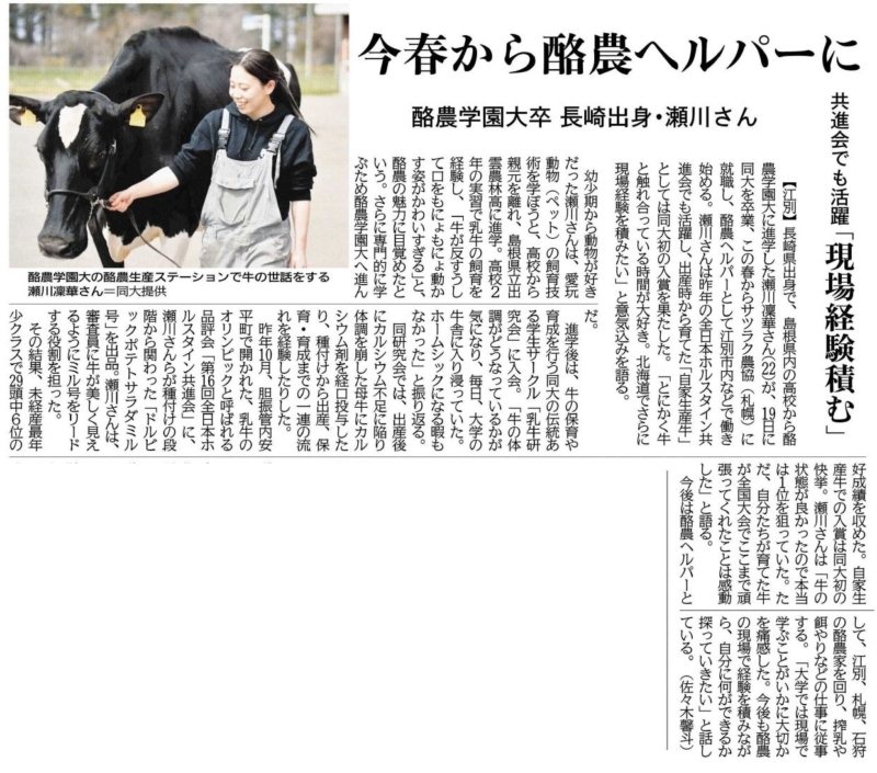 2026年3月20日(金)の北海道新聞(江別)16面にて、本学循環農学類4年生の瀨川凜華さんについて記事が掲載されました。