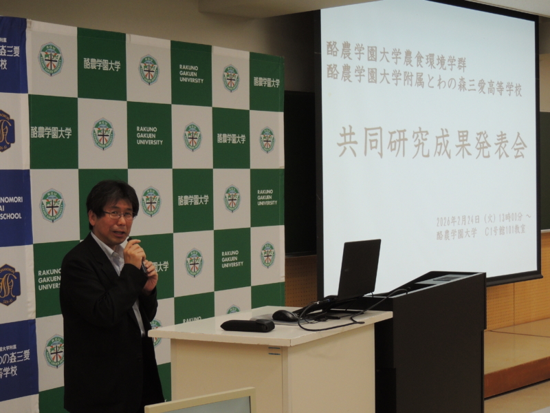 本学農食環境学群と附属とわの森三愛高等学校との高大一体教育における連携強化を目的とした共同研究成果発表会が、2026年2月24日(火)に開催され、当日は約120名(高校生・大学生・教職員等/オンライン視聴参加17名を含む)が参加しました。