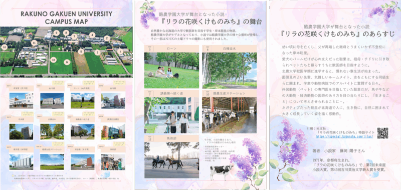 入学式当日、中央館1階及び黒澤記念講堂前・黒澤酉蔵像付近にフォトスポットを設けます。早めに到着された方や、入学式や学類オリエンテーション後にお時間がある方は、是非お立ち寄りいただき、ご入学の記念写真の撮影場所としてご活用ください。また、本学がモデルとなった小説「リラの花咲くけものみち(小説家 藤岡陽子さん著)」の舞台となった場所を紹介するマップや、著者である藤岡陽子さんからいただいたメッセージ等を展示いたします。是非ご覧いただき、また、学内を自由に散策いただければと思います。