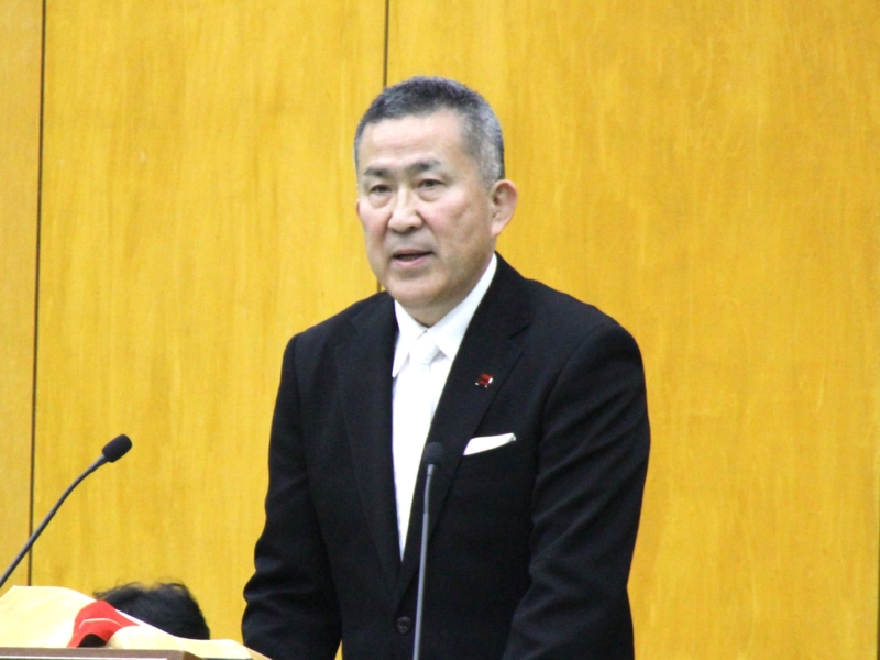 髙島理事長は「新入生の皆さん、ご入学おめでとうございます。そして保護者の皆さまにも心からお祝い申し上げます。社会の宝物であるご息女・ご子息をお預かりするその責任の重さを痛感しております。さて、人が成長するためには何が必要か。それは「なぜ?」「どうして?」と問いを続けることです。その積み重ねがやがて自分の軸となり、社会を支える力へとつながっていきます。また、私たちの行動のよりどころとなる「三愛精神」=「神を愛し、人を愛し、土を愛す。」もまた私たちに問いを投げかけてきます。常に真理とは何かを追い求め、それが一体どういうことなんだろうと問い続けてください。本学には広いキャンパス・フィールドがあります。ぜひ歩き回って、現場をよく観察して、色々なこと・人に出会って、ご自身の感性を大いに磨いていただきたいと思います。」と述べました。