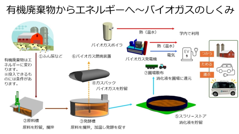 本実証実験は、広大なキャンパスにおける新たな移動手段の導入可能性を検討する取組みの第一歩として実施されたもので、走行エネルギーには学内農場の牛のふん尿から生成したバイオガスによる発電電力を活用しており、本学ならではの資源循環型キャンパスの実現に向けた試みとなっています。