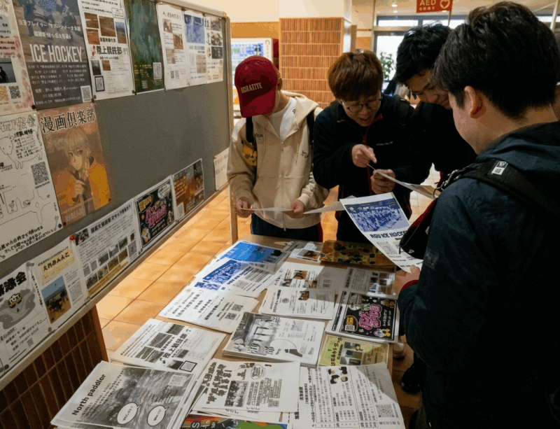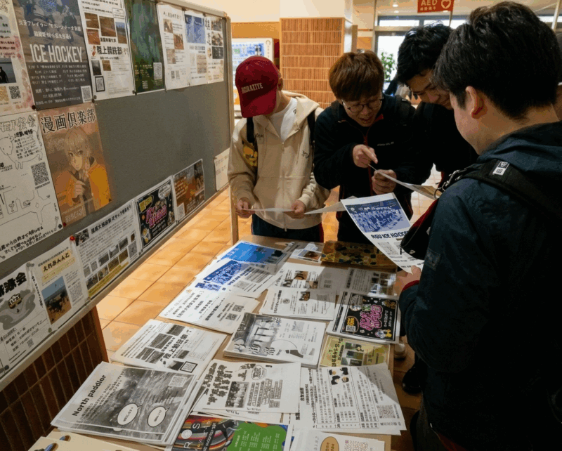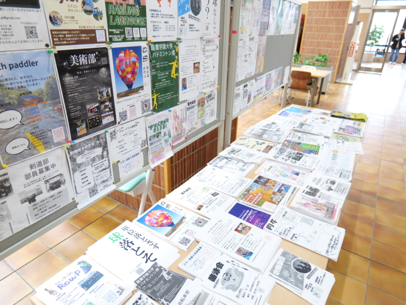 本学の中央館1階に設置された掲示板には、各団体の活動内容を知らせるポスターが所狭しと掲示されました。スポーツ系から文化系、各種ボランティアまで多岐にわたる団体のポスターが並び、掲示板の前の長机にも各サークルが作成した多種多様なチラシが置かれており、新入生が自由に手に取っていました。