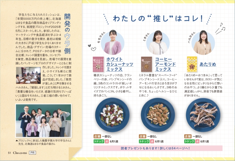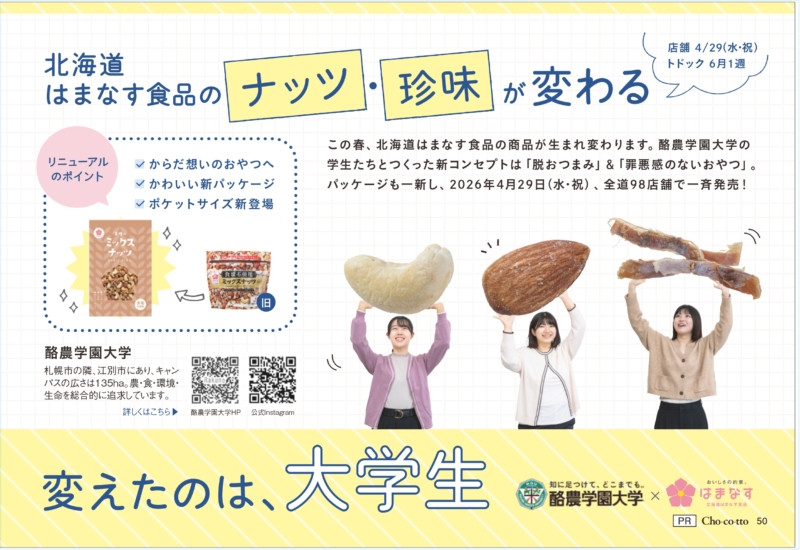 本学農食環境学群 食と健康学類 流通マーケティング研究室(増田祥世准教授)と循環農学類 食物利用学研究室(宮崎早花講師)の学生が活協同組合コープさっぽろ(以下、コープさっぽろ)様と、北海道はまなす食品株式会社様と開発した「珍味とナッツシリーズ」を4月29日(水)に発売します。
