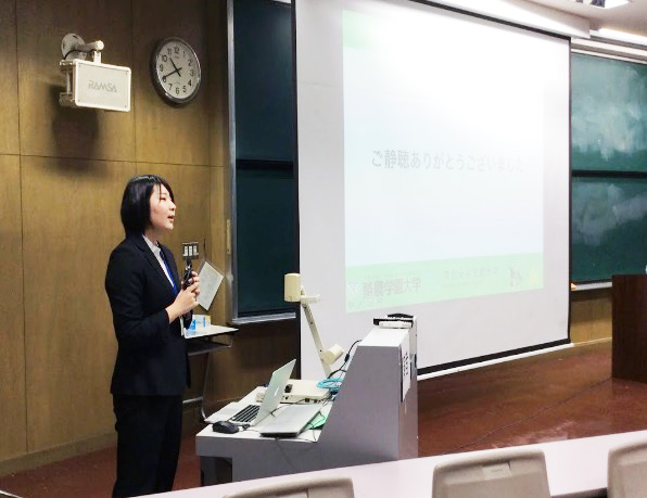 「この度はこのような栄えある賞にお選びいただき大変嬉しく存じます。今回の研究発表は山口太一先生をはじめ、多くの先生方や先輩方のご指導のもと、後輩たちの協力もあり、遂行することができました。本当にありがとうございました。今後も研究の成果を挙げられるよう精進して参りますので、ご指導ご鞭撻のほどよろしくお願い申し上げます」