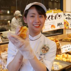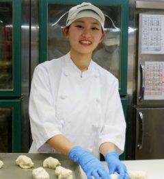 12月4日(火)には、3年生の小河菜々子さん、芝田志織さんの2名が店頭に立ち自身が考案したパンをお客様に紹介しました。また3年生の岡崎茉衣さんは、厨房に入って仕込みを体験しました。