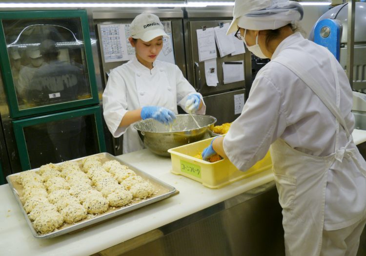 A 明日への仕込み作業を体験しました。「和風ピロシキ」というパンの仕込みを行いました。ひじきの煮物を詰めて、パン粉をつける作業もやりました。他にも、ちくわパン、チーズボール、アップルパイ、パイ生地をポーションする作業などを体験させてもらいました。