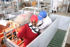 12月14日(金)、本学のフィールド教育研究センター肉畜生産ステーション内豚舎にて、獣医保健看護学類4年生の授業「総合臨床実習B」において、菅野美樹夫教授(生産動物看護研究室)の指導のもと、豚のお産介助を体験しました。同学類の学生が生産動物の実習を行うのは今回が初めてになります。