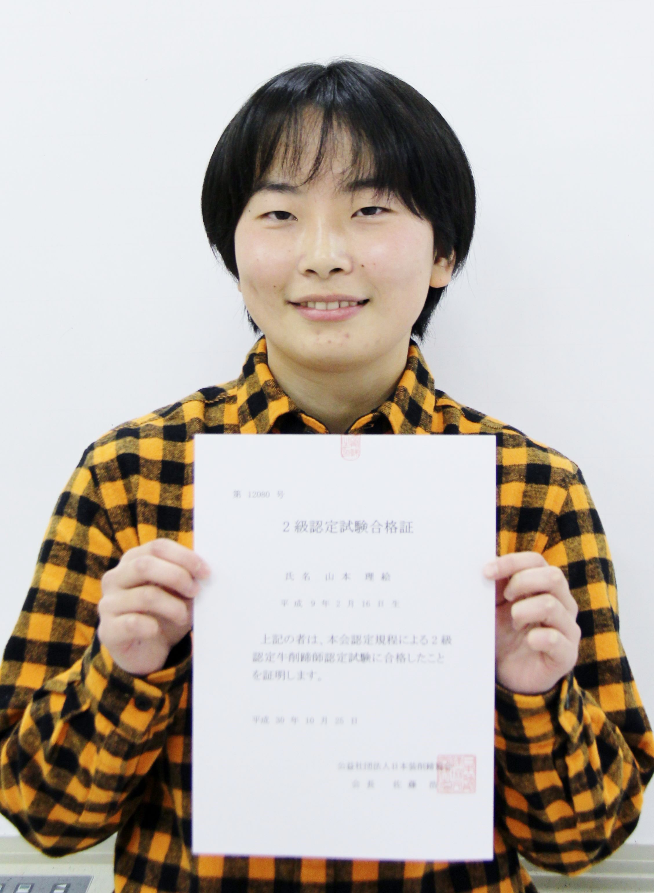「3年生まで牛に関わることがなかったので、削蹄師の資格取得は難しいと思っていました。4年生になって菅野先生が着任されてから、牛に関われる環境へと変わりました。はじめは牛が怖くて、足を上げることができませんでした。それが次第にできるようになった喜びと、怖かった牛が今ではかわいくて仕方ありません。削蹄のこと学ぶようになってからは、実習先の農家でも牛の蹄が気になるようになり、これまでとは意識が変わりました。資格試験を通じて、この様な機会を与えていただいたことに心から感謝しています。卒業後は、産業動物の動物看護師として、いろいろな分野の方々と関わって技術や知識を吸収し、これからの仕事に生かしていきたいと思っています」と話しました。