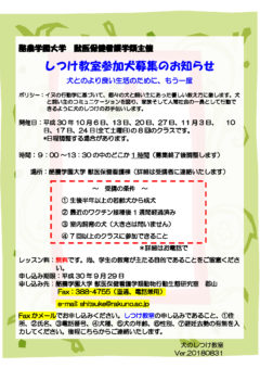 本学獣医保健看護学類主催による、犬のしつけ教室の参加犬を、下記の通り募集いたします。