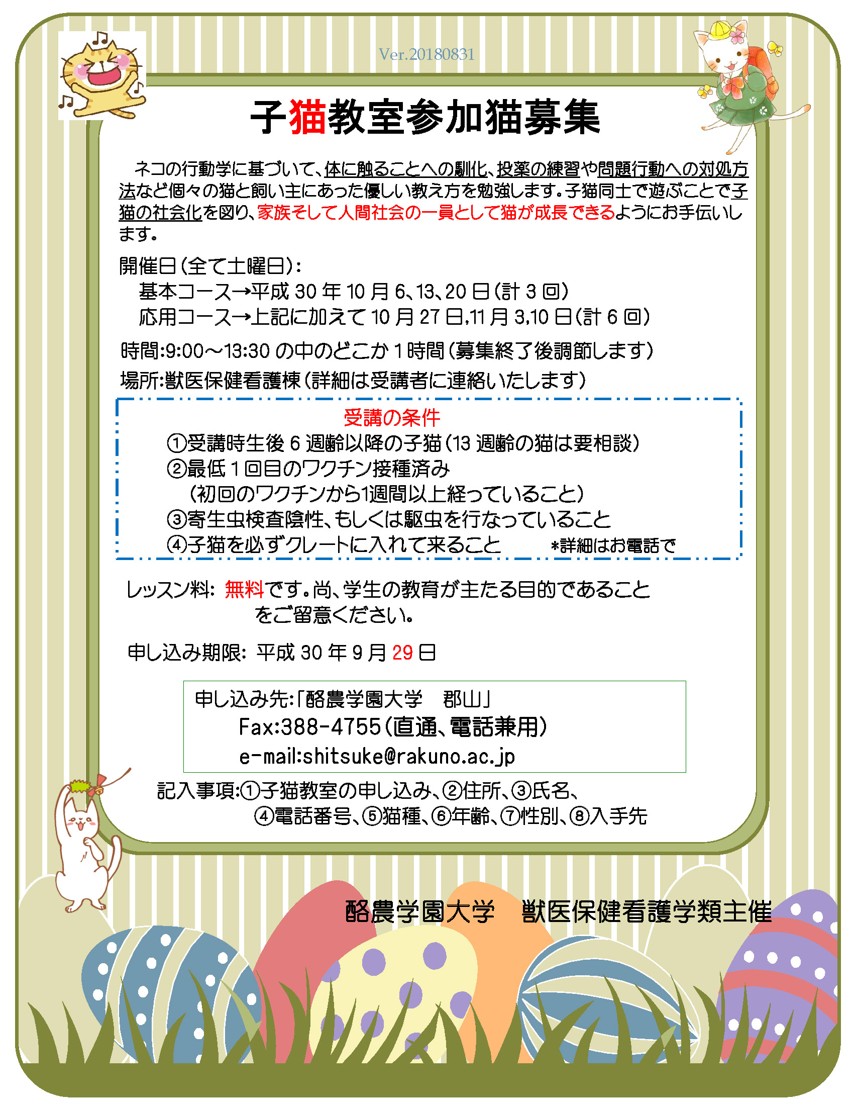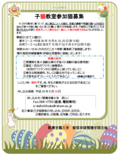 | ◆申し込み先 | 「酪農学園大学 郡山」 Fax:388-4755(直通、電話兼用) e-mail:shitsuke@rakuno.ac.jp 記入事項:①子猫教室の申し込み、②住所、③氏名、④電話番号、⑤猫種、⑥年齢、⑦性別、⑧入手先 |