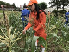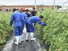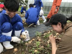 学生たちは、美味しい野菜の見分け方や上手な収穫の仕方を教わりながら、ミニトマト、ジャガイモ、トウモロコシ、タマネギを袋いっぱいに収穫しました。