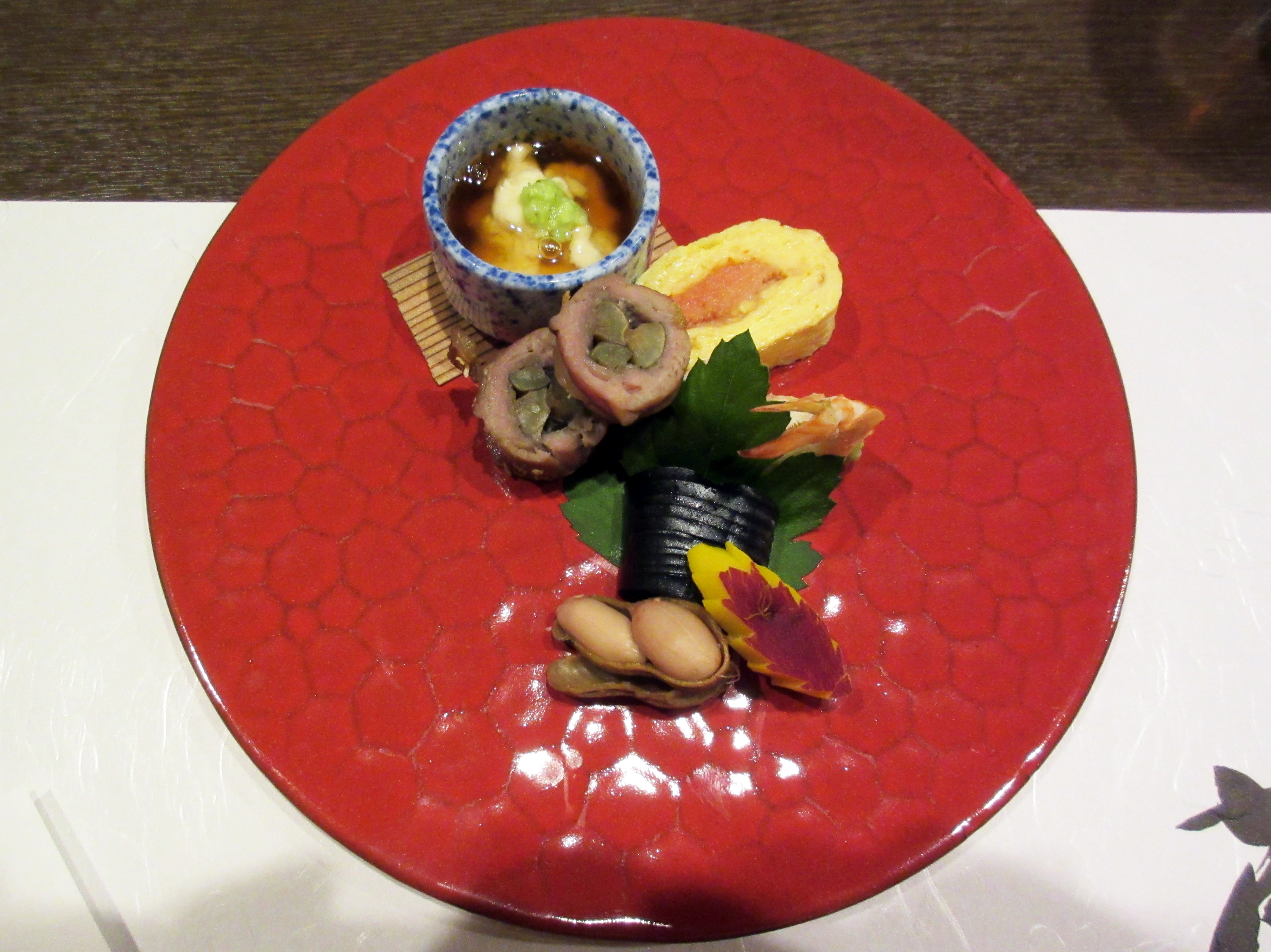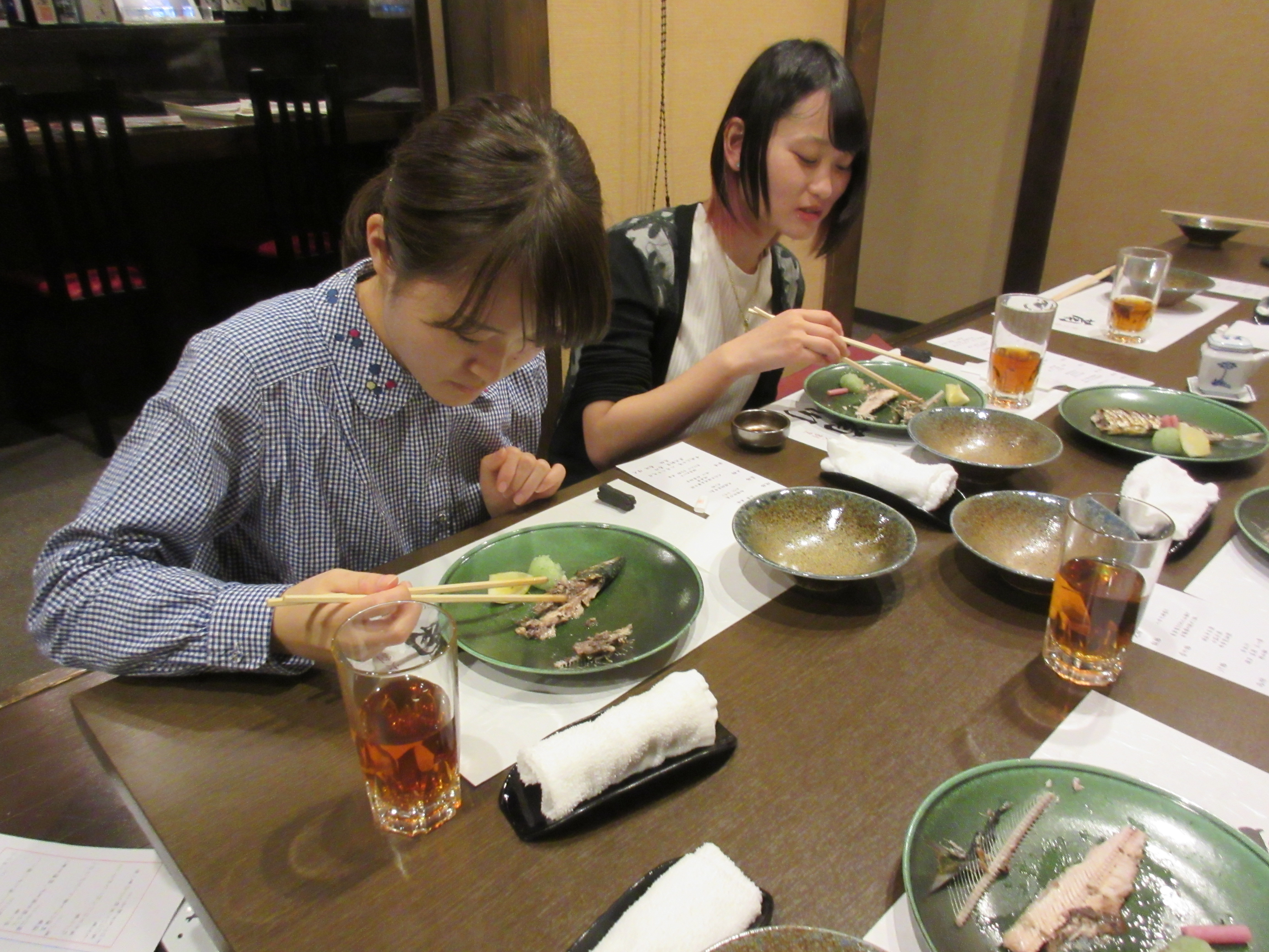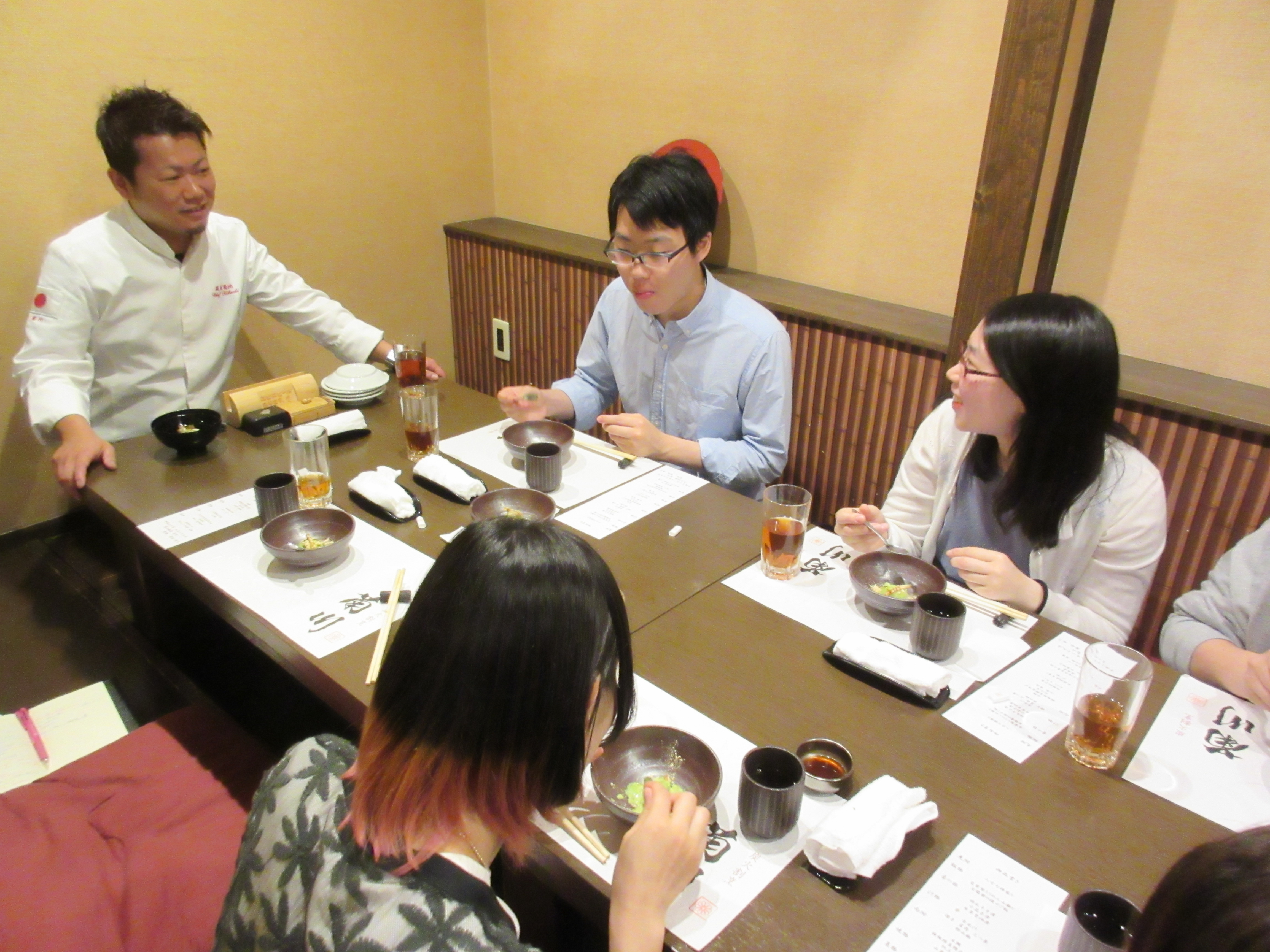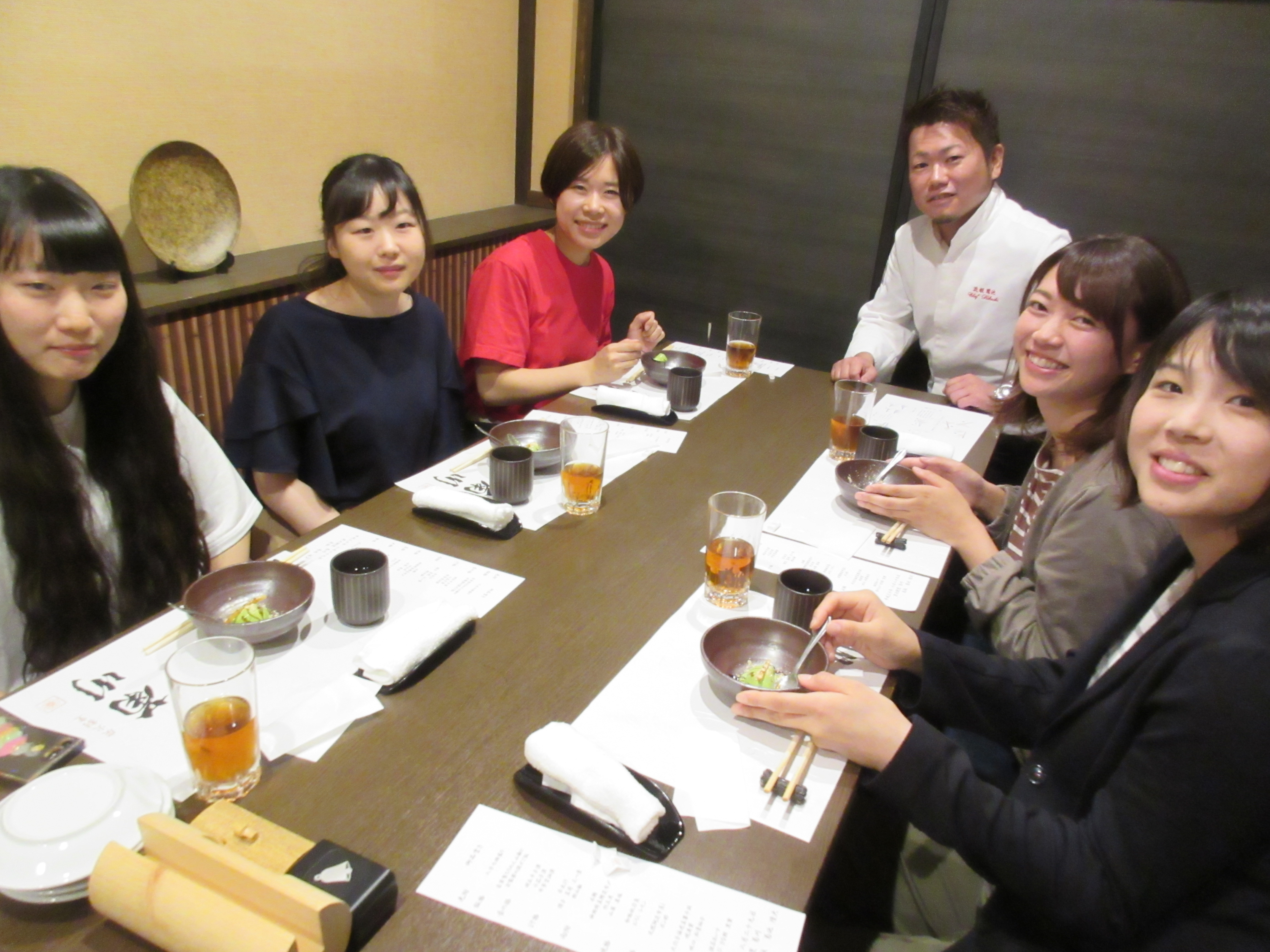炭火割烹菊川では、花板の菊池隆大氏より「道南の食文化を通じて和食のテーブルマナーを学ぶ」と題し、茶懐石の形式で料理をいただきながら和食の作法と調理技法を中心に講義を受けました。菊池氏は全国・全道規模のコンクールで多数の受賞経験を持つ、新進気鋭の和食料理人であり、今回は学生たちの勉強のために昼間の仕込み時間を割いて、講義を行って下さいました。講義では、和食における盛り付けの基本や一皿で表現される料理の配置の意味、食材の調理方法やその工夫などについて詳しく説明を受けました。そのほか、焼き魚を食べる際に身から取った骨の置き方、かえしの折り方と使い方、大皿で料理が来た場合に盛り分ける方法など、普段よく遭遇するシーンでの和食の作法についても学びました。更に「学生のうちに良い物を食べさせたい」という菊池氏の思いもあり、普段は入手が難しい戸井産マグロや神経締め鱈のお造りを提供して下さいました。学生たちは和食の作法を習得しようと非常に緊張した様子でしたが、料理が出てくるたびにその美しさと美味しさに感嘆し、舌鼓を打ちながら楽しく素養を高めることができたようです。