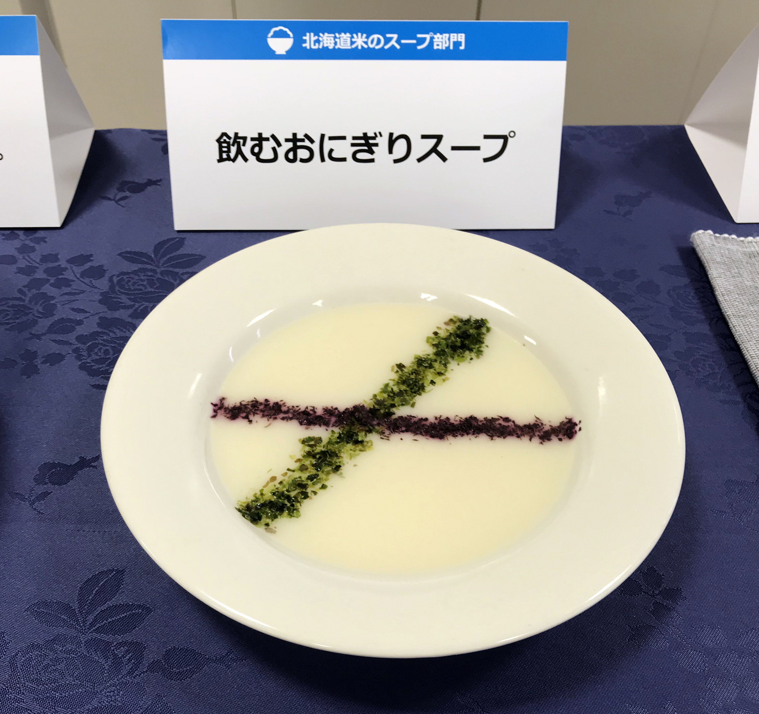 受賞した岡崎さんのレシピは「飲むおにぎりスープ」です。じゃがいもと玉ねぎに白だしを加え、米をお粥状に煮込みました。お粥が苦手なお子様や、咀嚼が難しい方もお米の美味しさを味わうことができ、冷やせばビシソワーズ風、温めればポタージュ風として食べられます。審査員からは「北海道の象徴的な素材であるじゃがいもや玉ねぎなどの素材がお米と見事に融合し、お子様や咀嚼困難者にも優しいスープとなっている。手軽に作れ、しかも冷たくても、温めても美味しい」と高い評価を受けました。
