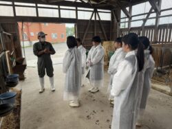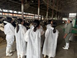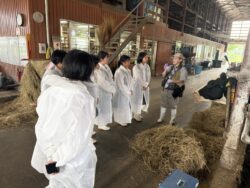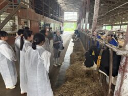高校1年生から3年生までの6名が北海道農業実習における見学先の一つとして本学へ見学に来てくれました。酪農生産ステーションでは哺育舎やフリーストール牛舎等を見学して回り稲森剛技師にご説明いただきました。見学中に、酪農生産ステーションでの実習を行っていた獣医学類福森理加准教授(ハードヘルス学ユニット)からご説明いただくこともでき、実習中の在学生へ質問する場面もありました。見学後は、茨城県水戸農業高校を卒業した在学生との交流も行いました。