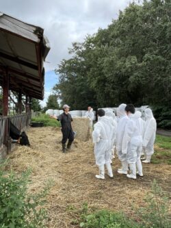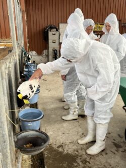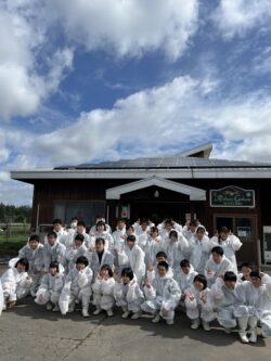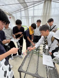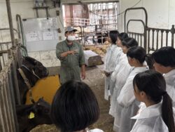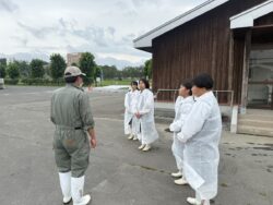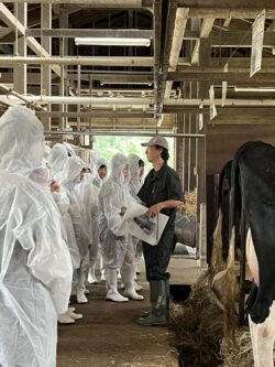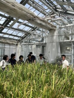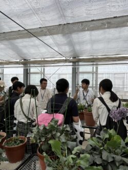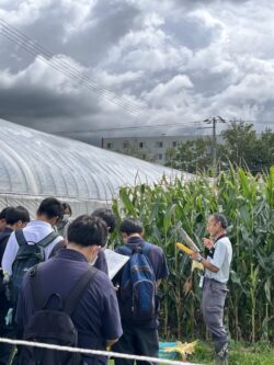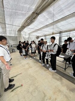 高校2年生34名の生徒さんが見学に来てくれました。最初に酪農生産ステーションにて繋ぎ飼い牛舎やフリーストール牛舎、哺育舎等を見学して回り有吉亨介技師と佐藤雄平農事課長にご案内いただきました。その後、作物生産ステーションへ移動し、循環農学類森志郎教授(園芸学研究室)から園芸棟と作物棟をご説明いただき、畑作圃場を同学類義平大樹教授(作物学研究室)、水田を同学類林怜史准教授(栽培学研究室)にご案内いただきました。見学中は熱心にメモをとる様子が印象的でした。環境制御型のガラスハウスやビニールハウス、露地圃場等を見学することで本学の学びに触れていただきました。