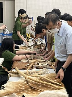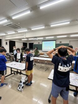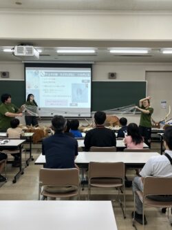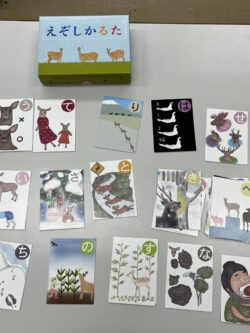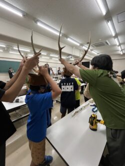 旭川工業高等専門学校が企画する北海道ジュニアドクター育成塾に参加した小学生・中学生・高専生の29名が本学へ見学に来てくれました。最初に動物医療センターを見学し、伴侶動物医療部門を獣医学類山﨑裕毅准教授(伴侶動物内科学ユニット)、生産動物医療部門を石原茉紘動物看護師、斉藤志歩動物看護師にそれぞれご案内いただきました。その後に、環境共生学類伊吾田宏正准教授(狩猟管理学研究室)による模擬講義を聴講しました。講義中には積極的な質問や発言が多数みられました。また、”子どもから大人まで、楽しく遊びながらエゾシカの生態や歴史を学び、正しくシカと付き合っていく“ ことをコンセプトに制作された「えぞしかるた」をとても元気に取り組みました。最後に、角や毛皮などのトランクキット(教材セット)を用いて、