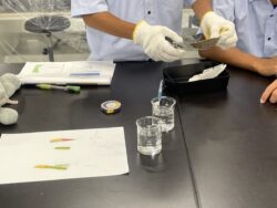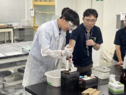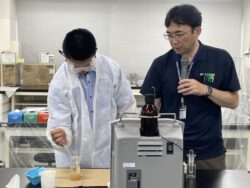 2年生18名がアカデミックインターンとして本学に来てくれました。最初に学食体験として生協で昼食をとり、その後2グループに分かれて模擬講義を聴講しました。環境共生学類吉田磨教授(環境地球化学研究室)は「地球温暖化の現状とリスク~未来を守るために私たちにできることは何か?~」について講義いただき、大学院生よにる海洋研究について紹介していただき、その後、実際に実験も行っていただきました。最後に全体ディスカッションを通して、グローバルな課題を自分ごととして探求する時間となりました。獣医保健看護学類林英明教授(動物生命科学ユニット)では「動物看護学教育と動物看護師の役割」について講義いただきました。講義後にはスキルスラボ棟へ移動し、様々な実習を行うことができる教室を見学して回りました。見学の最後にスキルスラボ棟3階の薬局調剤室にて、薬包紙にブドウ糖を計量し、分包機の操作を体験しました。どちらのグループも様々な学びを体験していただきました。