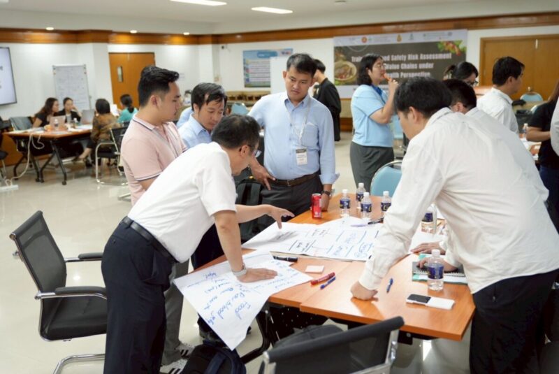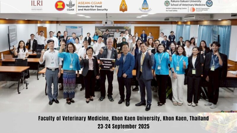 農場から食卓までの衛生を保ち、消費者の健康を守る食品衛生はASEAN諸国の優先課題です。2025年9月23日と24日にかけて、ASEAN-国際農業研究評議グループ(CGIAR)食品と栄養保障革新プログラムの一環で、国際家畜研究所(ILRI)がタイ国コンケン大学獣医学部および酪農学園大学国際獣疫事務局(WOAH)食の安全コラボレーティングセンターと共同で、コンケン大学にて「ワンヘルスの視点から見た非正規流通における食品衛生リスク評価研修」を開催しました。