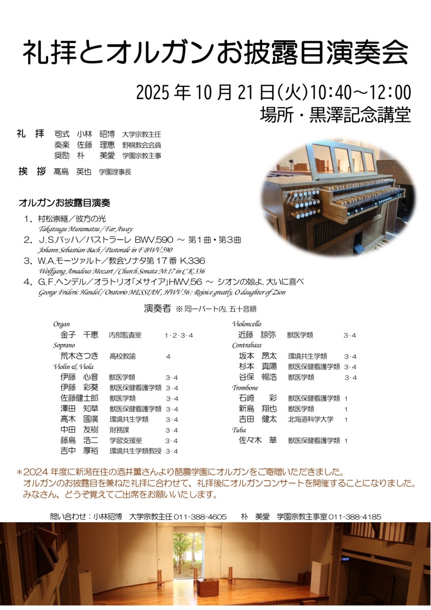2025年10月21日(火)にオルガン披露礼拝・オルガン演奏会が行われます。第1部は通常の後学期第5回大学礼拝をオルガン披露の礼拝として行い、第2部はオルガン演奏会(コンサート)を行います。