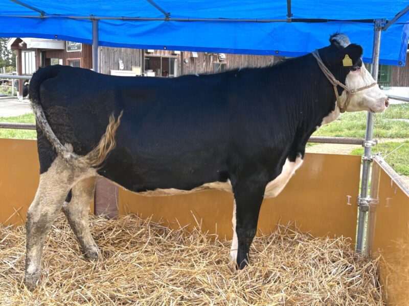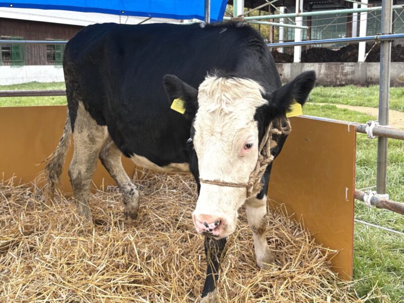 寄附いただいた牛は、2023年12月11日生まれのホルスタイン種とモンベリアード種のF1(交雑種)です。現在妊娠中で、お腹にはモンベリアード種系統の雌の子牛が宿っており、2026年1月中旬の出産が予定されています。