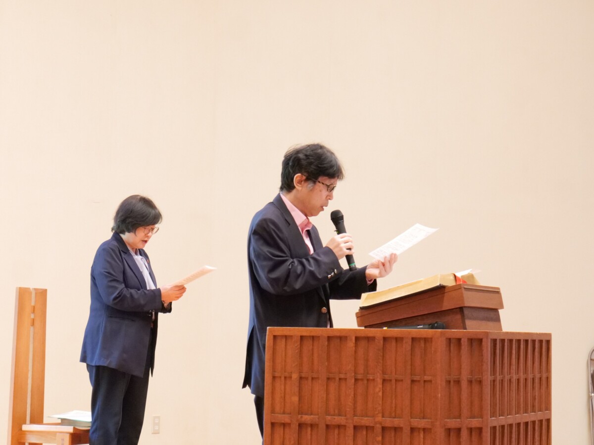オルガン寄贈者の酒井様と一緒に壇上に上がり、ご寄贈への感謝とお礼を述べるとともに、寄贈者名が入ったプレートをオルガンに表示しておくことが述べられました。