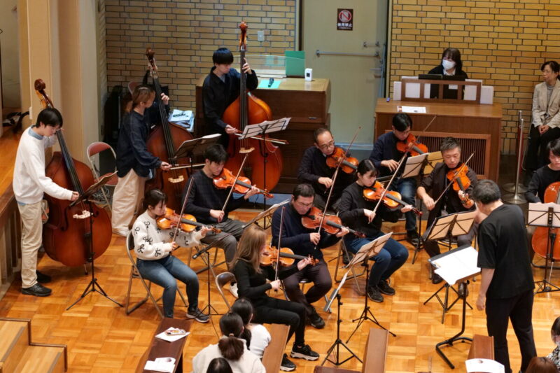 第2部は髙島英也理事長の挨拶の後、オルガンお披露目演奏会が行われ、4曲が披露されました。黒澤記念講堂内にオルガンを中心とした学生・教職員の楽器演奏のハーモニーが響き渡り、学生・教職員もうっとり聴き惚れていました。