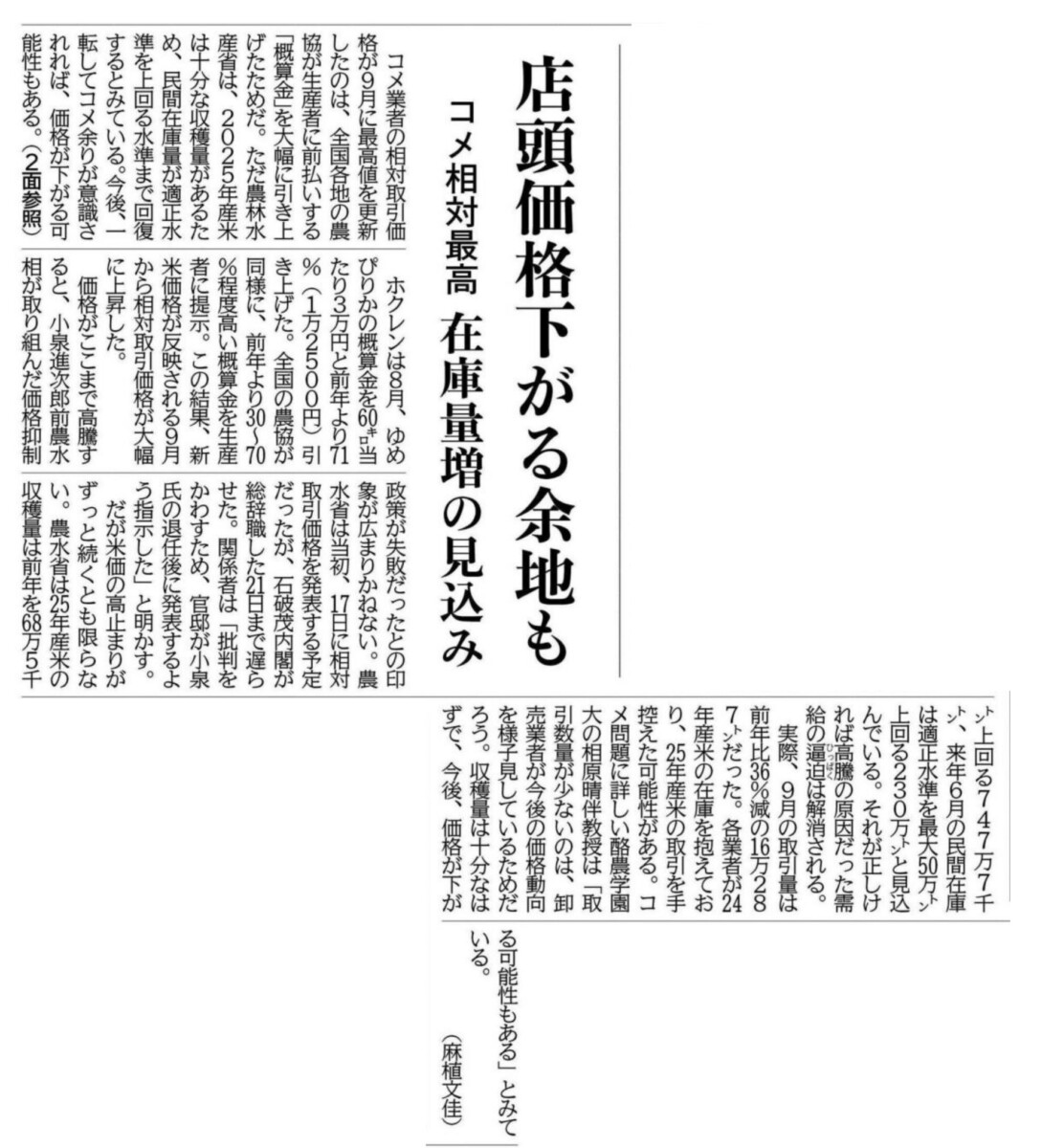 2025年10月22日(水)の北海道新聞朝刊にて、本学循環農学類の相原晴伴教授(農畜産物市場論研究室)がコメントした記事が掲載されました。