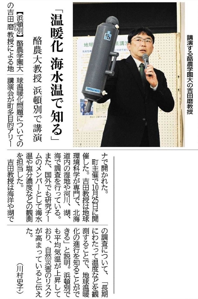 【北海道新聞】「温暖化 海水温で知る」酪農大教授 浜頓別で講演(環境共生学類 吉田磨教授)