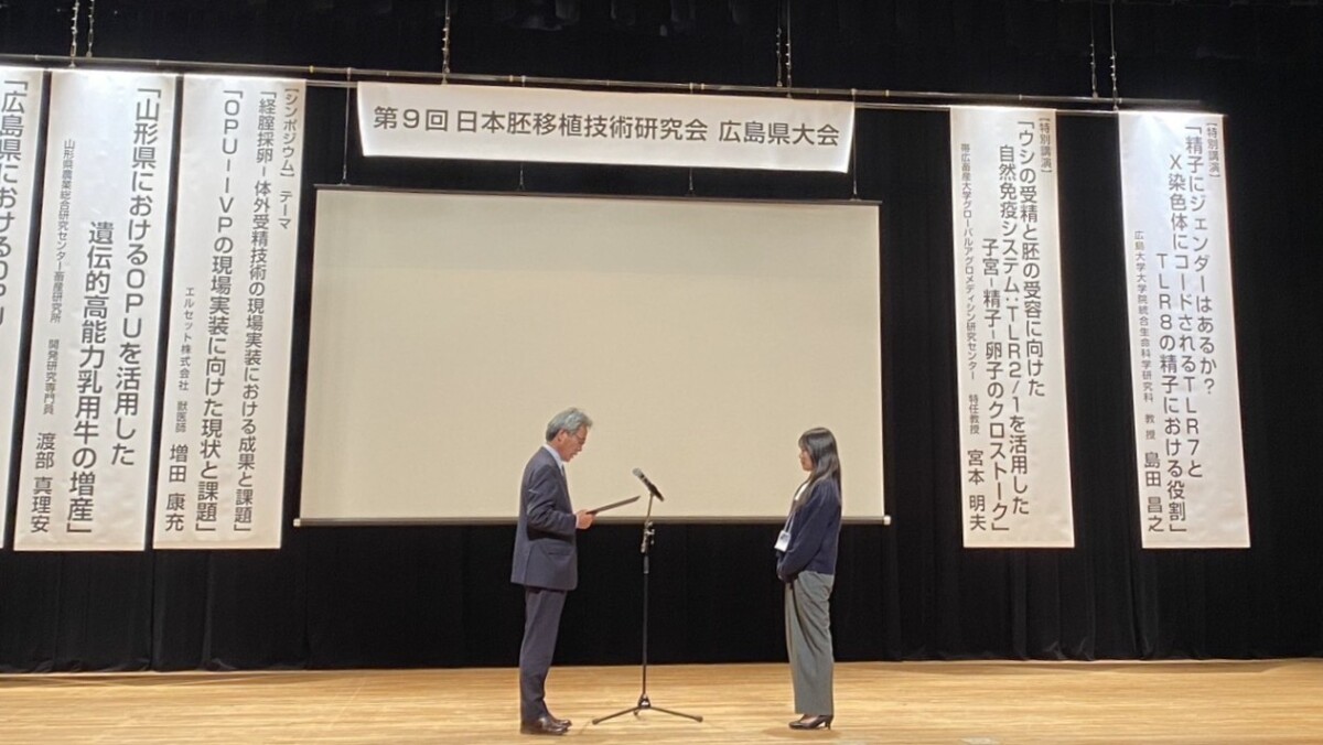 本学酪農学研究科の福田侑美さんが第9回日本胚移植技術研究会広島県大会で優秀発表者賞を受賞