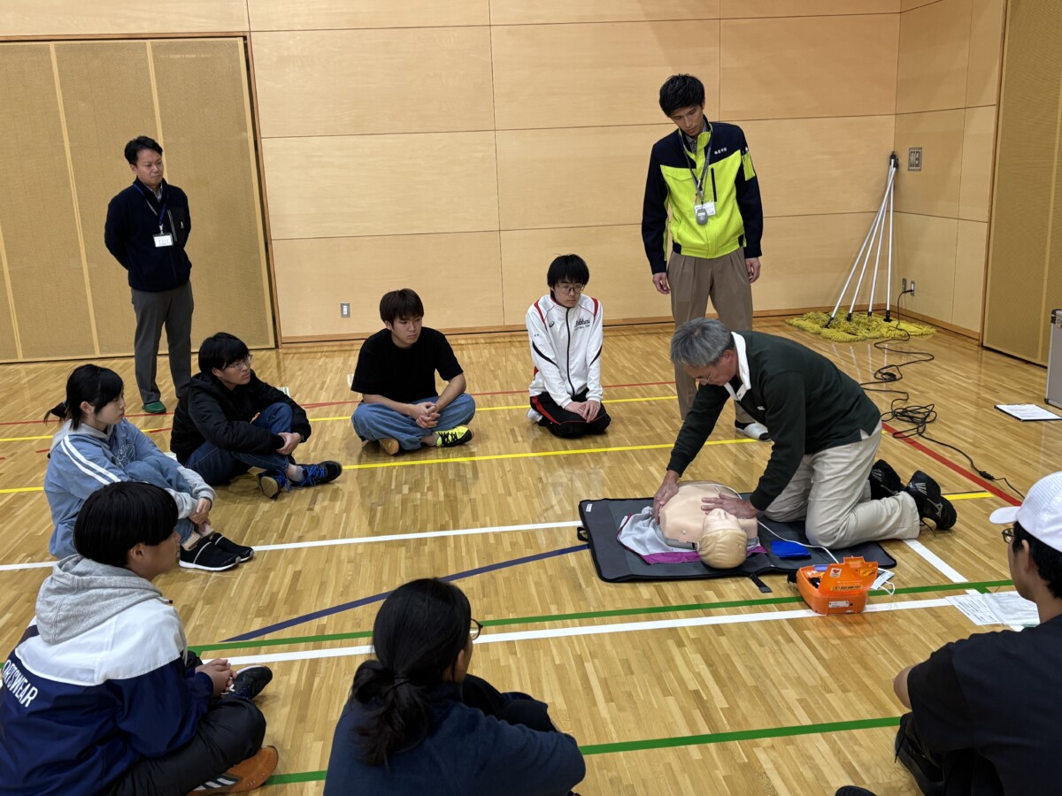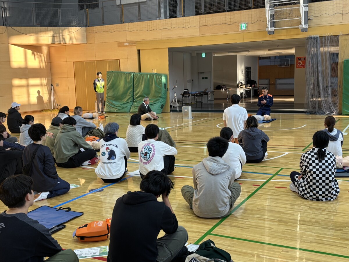 今回の講習会は、体育系と文化系の課外活動団体の学生に加えて、希望する一般の学生、教職員に参加していただきました。会場となった健民館アリーナ1には約40名の参加者が5グループに分かれ、救急車が到着するまでの約9分間を想定し、1人ずつ胸骨圧迫とAEDの使い方について実践的な演習を行いました。また、今年8月に応急手当普及員となった本学職員もサポート役を担いました。参加者からは、消防隊員への質問も出て、活気のある講習会となりました。